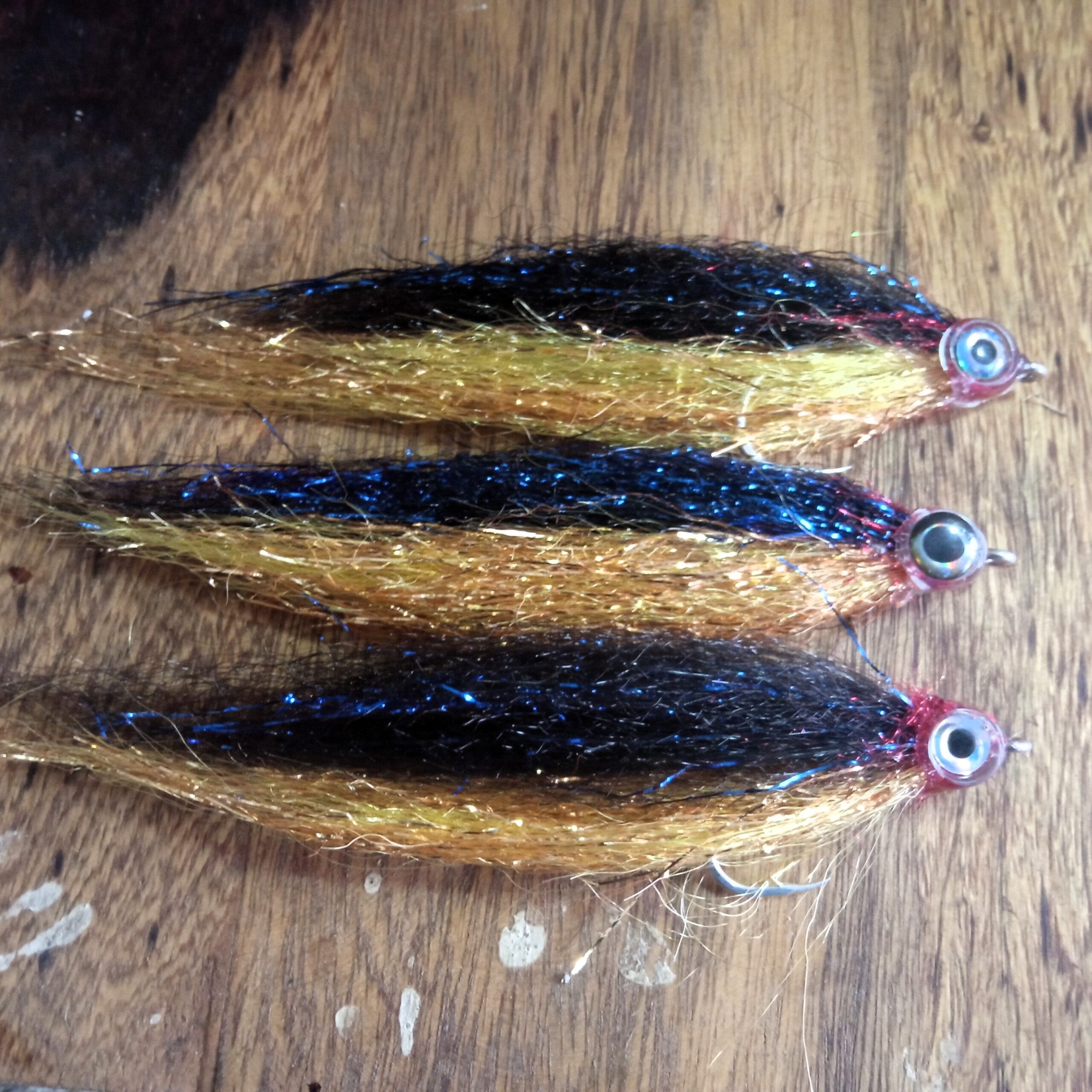I have 3 Gold Bomber flies for sale here. Tied on Gammakatsu sl12 6/0 Hooks great profile tough as all getout flash throughout the fly. Don’t pay $17 each for similar here only $17 for 3 Plus $3 post.